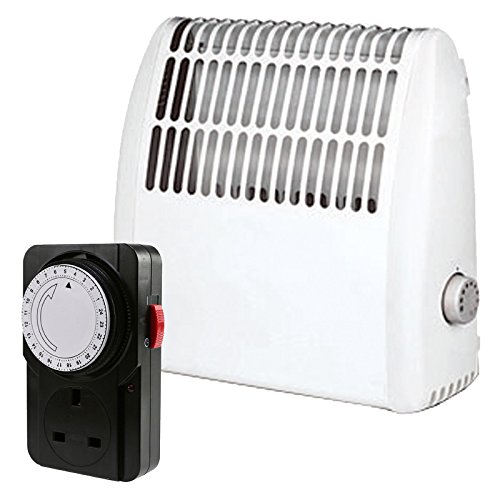 Wall mounted heater and timer set to keep you warm and save you money this winter Wall mountable convector thermostatic heater specifications: Model - FW-500 Color - White/Grey Wattage - 500 Power supply - 220-240V / 50Hz Dimensions - H 255 x W 272 x D 110mm Ideal for any room even sheds, garages, lofts, conservatories & greenhouses An indicator light on the side of the unit lights up to show when the unit is active and fully warmed-up Re-settable thermo-fuse switches off unit if it overheats and switches it back on again once it has cooled down Plug in timer specifications: Maximum current - 13 Amp Max wattage - 3120W / 220-240V / 50Hz The timer plugs into a mains socket and you then plug the heater into the socket on the timer After setting the timer, your heater will automatically switch off at your chosen desired time Timed operation of your electricals saves you money by stopping the supply of energy when appliances aren't in use Read more details..